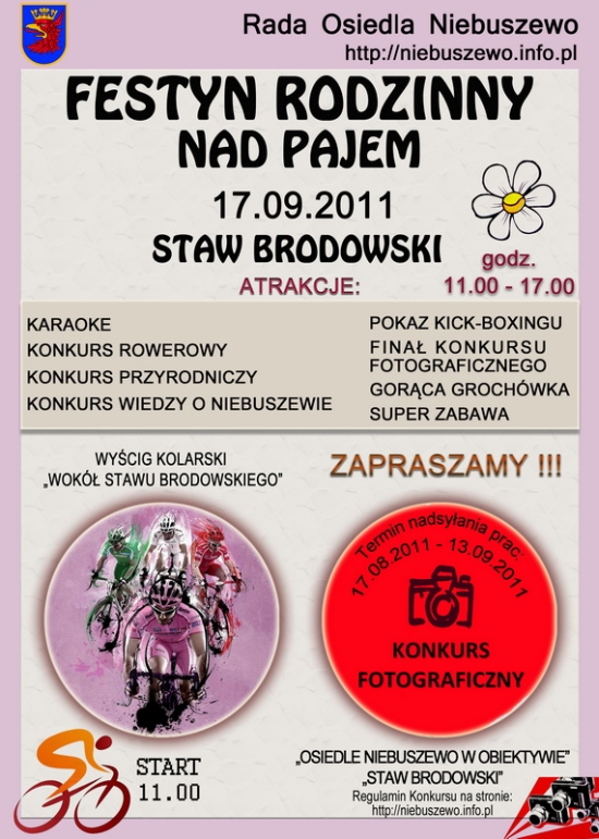 17 września od 11:00 do 17:00 Rada Osiedla Niebuszewo zaprasza na rodzinny festyn. W ramach festynu odbędą się: konkurs wiedzy o Niebuszewie, konkursy karaoke, konkursy przyrodnicze, pokaz kickboxingu, wyścigi rowerowe.