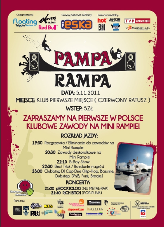 „PamPa Rampa” to jedyna impreza nasycona tak ogromną dawką atrakcji, która sprawi, iż będziecie świadkiem wydarzenia mocno wyrastającego ponad zwykłą imprezę klubową. Grupy Ex Sports, Floating Trippin’ Festival oraz Red Bull zapraszają i zapewniają, że tej imprezy nie zapomnicie na bardzo długo! Wpadaj i łap energię!