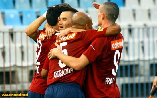 Przewaga Pogoni została przypieczętowana pod koniec pierwszej części meczu. Pierw w dobrej bramkowej sytuacji mocny strzał Frączczaka na rzut rożny wybił Krzysztof Stodoła, bramkarz Olimpii, a po chwili precyzyjne dośrodkowanie Ediego z rzutu rożnego celnym strzałem głową na bramkę zamienił właśnie Frączczak.