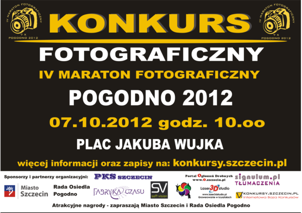 7 października 2012 r. (niedziela) o godzinie 10:00 ruszy IV Maraton Fotograficzny. Miejsce startu to tradycyjnie Plac Jakuba Wujka. Zgłaszać się można pod adresem e-mail: maratonfoto@op.pl. Potrzebne dane do rejestracji uczestnika IV Maratonu Fotograficznego POGODNO 2012 to: Imię i Nazwisko, data urodzenia, telefon oraz adres e-mail. Zarejestrowane osoby proszone są o zapamiętanie swojego numeru startowego, pozwoli to na sprawniejszą obsługę podczas rejestracji.