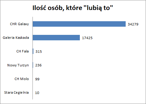 Jak się okazuje, bezkonkurencyjne jest Centrum Handlowo-Rozrywkowe Galaxy. Zgromadziło ponad 34 tys. „fanów”. Chociaż w sumie nie ma się co dziwić – często na tej stronie prowadzone są różne konkursy z atrakcyjnymi nagrodami, profil jest aktualizowany na bieżąco (np. użytkownicy dowiadują się o promocjach i nowych sklepach), a także można tam po prostu o coś zapytać i dostać odpowiedź dużo szybciej, niż w wysyłając maila.