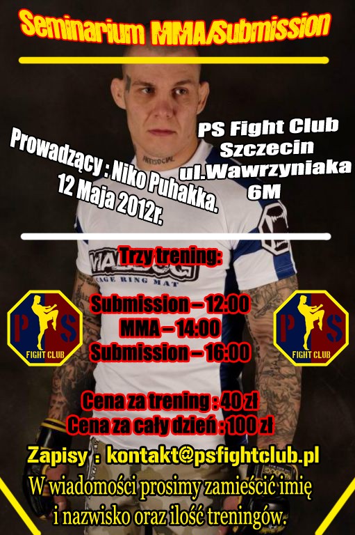 12 maja w PS Fight Club Szczecin przy ul. Wawrzyniaka 6M odbędzie się seminarium MMA/Submission z udziałem Niko Puhakki! Seminarium jest jednodniowe i obejmuje jeden trening MMA o godzinie 14:00 oraz dwa trening Submission o godzinie 12:00 i 16:00.