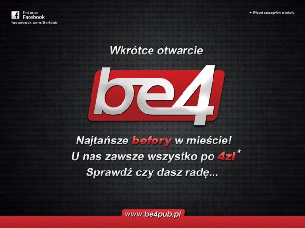 Nowy lokal będzie się mieścił na Królowej Jadwigi, tuż obok Propagandy, w miejscu dawnego Ego. Be4 jest pierwszym lokalem w mieście nastawionym na beforowe imprezy. W Be4 nie trzeba polować na promocje, ponieważ cały tydzień obowiązują stałe ceny: piwo, wódka, whisky, gin, rum oraz tequila będą za 4 zł.
