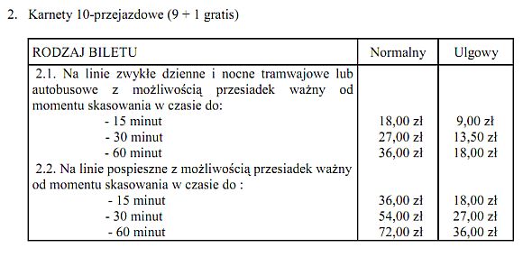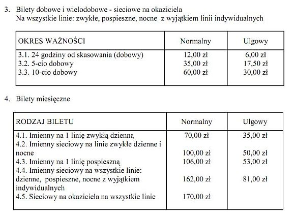 - Bilet na 3 miesiące (linie zwykłe dzienne + nocne) 260 zł (obecnie 218 zł).