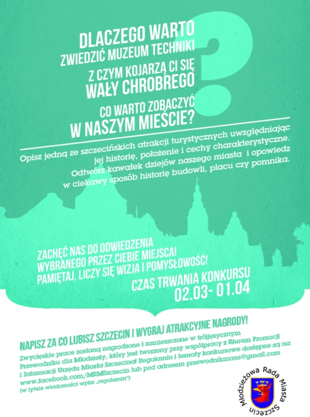 Młodzieżowa Rada Miasta organizuje konkurs dla uczniów szkół ponadgimnazjalnych. Zadaniem konkursowym jest opisanie jednego z wybranych miejsc w Szczecinie (lista poniżej). Oczywiście lista ta nie jest zamknięta, można zgłaszać swoje propozycje (do 9 marca na adres przewodnikmrms (małpka) gmail.com).
