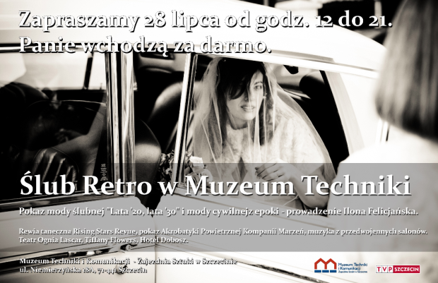 28 lipca w Muzeum Techniki i Komunikacji odbędzie się „Ślub retro”. Impreza potrwa od godziny 12 do 21. W sobotę w Muzeum pojawią się stroje cywilne i ślubne inspirowane modą lat dwudziestych i trzydziestych XX wieku, przedwojenne smakołyki z kuchni najlepszych restauracji i inne niespodzianki w stylu retro. Atrakcje znajdą się na dziedzińcu i w muzeum.