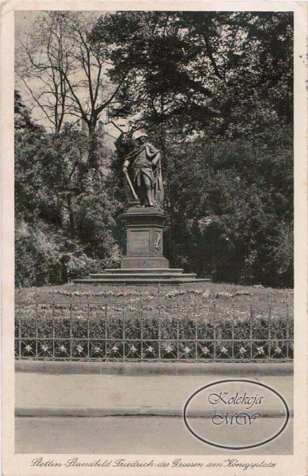 i ruszamy w stronę Teatru Miejskiego. Po drodze przystaniemy na chwilę przy pomniku innego z niemieckich cesarzy – Fryderyka Wielkiego. Ten dość niesympatyczny dla nas, Polaków, władca uhonorowany został pomnikiem z piaskowca, wędrującym na przestrzeni lat po placu Żołnierza. Jako, że ptasie odchody nie służyły dobrze rzeźbie, wykonano jej spiżową kopię, a oryginalnego kaisera przeniesiono do muzeum. Jeśli mnie pamięć nie myli, rzeźba przetrwała wojnę, została odrestaurowana w Niemczech i po tournee po tym kraju wróci do naszego Muzeum Narodowego.