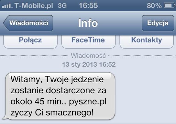 Po przyjęciu zamówienia dostajemy powiadomienie e-mailem oraz smsem – jest podany również czas dostarczenia jedzenia (i praktycznie zawsze był dotrzymany).