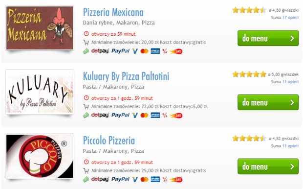 Akurat w moim zasięgu pojawiły się następujące miejsca: Pizzeria Mexicana, Kuluary by Pizza Paltotini, Piccolo Pizzeria, Kuchnia Polska, Euro Bistro, Hot Pizza Hrubieszowska, Subway Oxygen, Czili Cafe, Bar Mekong Turzyn, Grease Club & Restaurant, Pizzeria Tifoso, Variete Club & Restaurant, Vincent, Pizzeria Galeria, Lunch Bar Bazzar, Małe Co Nieco.