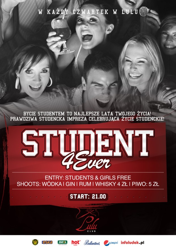 W czwartki w Lulu Club specjalne imprezy studenckie – Student 4ever. Podczas tej nocy będziemy mogli tańczyć do białego rana w szalonych klimatach muzycznych lat 80/90. DJe zabiorą nas do epoki, która upłynęła w rytmie disco, boogie i funky – będzie to okazja do zabawy przy największych hitach takich gwiazd jak ABBA, Kool & The Gang, Boney M., Earth Wind & Fire, Chic, Jackson Five, A Taste Of Honey. Początek imprezy o godzinie 21:00.