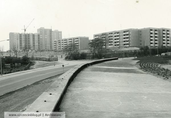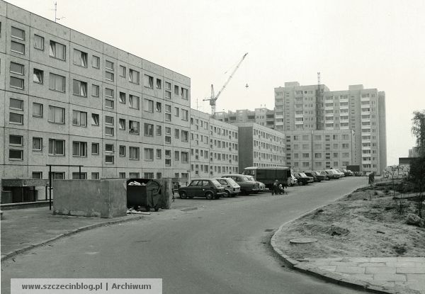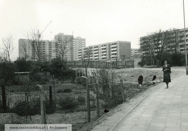 1. Widok z garaży przy ul. Wilczej od bloków Huty Szczecin na „Osiedle Książat Pomorskich” – z widocznymi ulicami: Zaplecze ul. Myśliwskiej, plac budowy pawilonu „Spożywczego”, wieżowce przy ul. Świętoborzyców 32-38