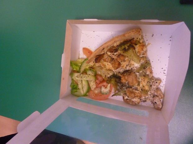 W dniu pisania tego tekstu poszłam na kawę i skosztowałam tarty z kurczakiem i brokułami. Na tartę zdecydowałam się na końcu, bo nie do końca mi się podobała wizualnie. Ale okazało się, że jest bardzo smaczna, dobrze doprawiona, mimo że drób na tego typu daniach często smakuje kiepsko. Tu smakował wyśmienicie. Dodatkowo do tarty dostałam mini sałatkę skropioną oliwą (prawdziwą, nie olejem).