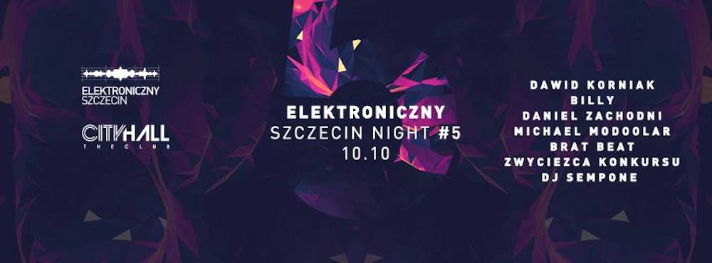 10 października (piątek) w klubie City Hall (3 Maja) odbędzie się impreza pod nazwą Elektroniczny Szczecin Night #5. Początek imprezy o godzinie 22:00. Do północy do klubu wejdziemy za 10 zł, po 24:00 zapłacimy 15 zł.