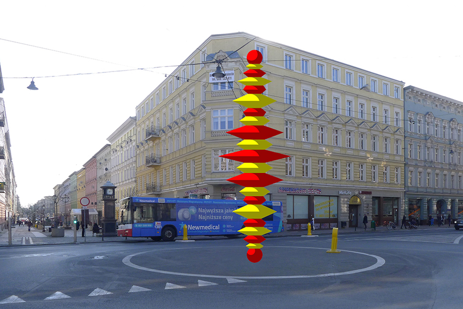 Moja rzeźba to gigantyczne wrzeciono, przeskalowana dziecinna zabawka, sznur ogromnych korali. Wertykalna a jednak nie falliczna, pozbawiona podstawy, przez co niezwykle lekka, jest bardzo kobieca, kusić chce każdym swoim elementem. Negocjacje dotyczące koloru były bardzo trudne – monochrom czy bi-kolor? Czarna, czerwona czy pomarańczowa? Ja miałem ochotę na rudymentarną triadę, pociągało mnie też tropikalne, “brazylijskie” połączenie cytrynowej żółci i soczystej zieleni. Ostatecznie wybrano wersję żółto-czerwoną – płomienistą, szalenie jaskrawą i witalną. Niech więc tętni kolorem – komuś się to pewnie nie spodoba – trudno, ktoś inny może głębiej zaczerpnie powietrza, uśmiechnie się, pomknie tańczyć – wspaniale. Życie to dynamika, nieustanna zmiana – mutacja jest kluczem do ewolucji – niech się dzieje – niech zawiruje świat.