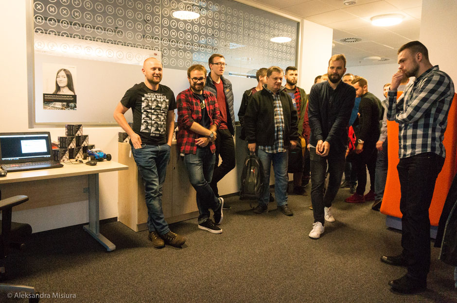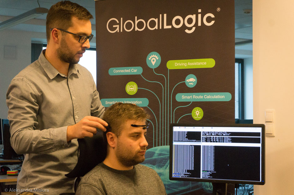 Oprócz mnie w wydarzeniu uczestniczyło ponad 60 osób, a pracownicy GlobalLogic przygotowali 7 stacji roboczych, przy których programiści przedstawiali cyfrowe zegary prędkości do aut, omawiali technologię ogniw do samochodów hybrydowych. Oczywiście można było też spróbować swoich sił w sterowaniu myślami samochodu (Black Mirror na żywo, przyznaję, miałam ciarki na plecach).