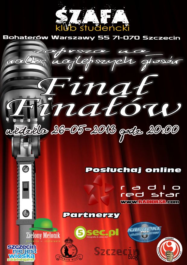On 2 czerwca 2013 / By Paweł KrzychW niedzielę 26 maja 2013 roku o godzinie 20:00 w Szafie (Bohaterów Warszawy 55) odbędzie się Pierwszy Finał Finałów w Karaoke. Najlepsi otrzymają następujące nagrody: I miejsce – ...